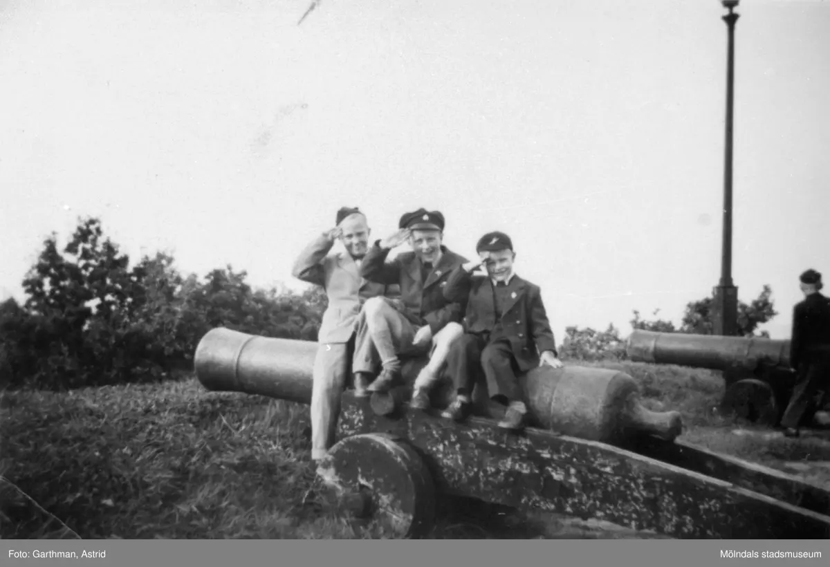 Kusiner som gör honnör sittandes på en kanon utanför Skansen Kronan i Göteborg. Från vänster: Per-Olof Larsson, Leif och Alf Garthman. 1950-tal.