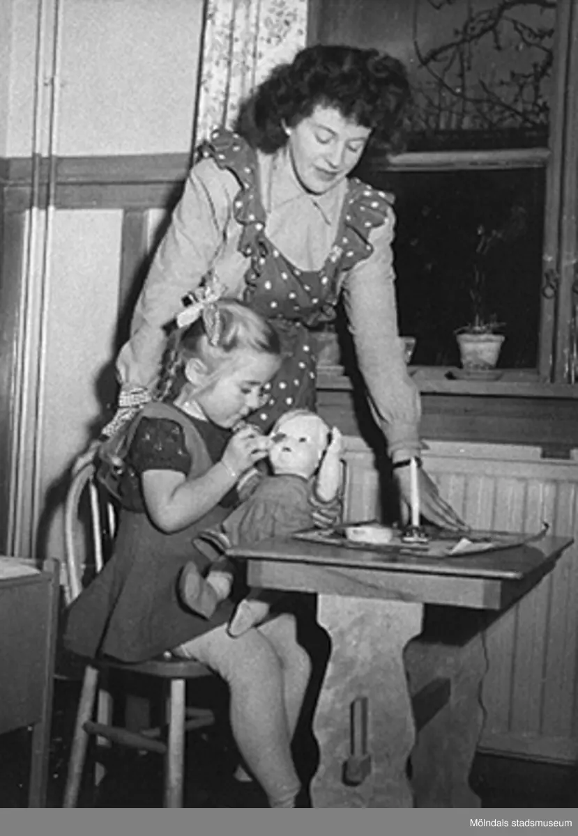 Bitr. föreståndare Margit Emilsson (gift Wannerberg -52) tittar på när en flicka pysslar om en docka, Krokslätts daghem år 1949.