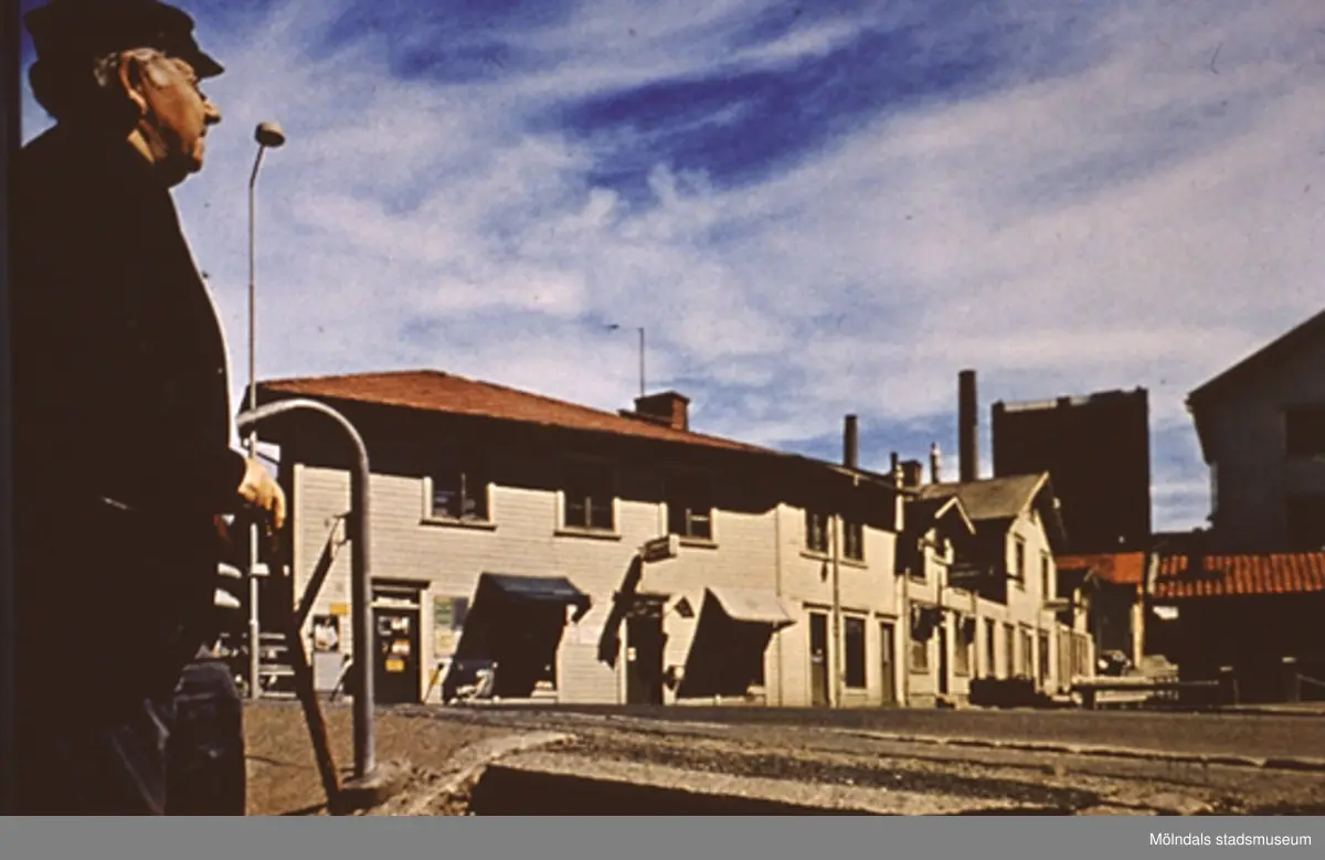 Götaforsliden fotograferad från Fisktorget/Feskeflôten i Kvarnbyn år 1964. Okänd man till vänster. Rakt fram ses byggnaden som senare blev Kråkans Krog. Relaterat motiv: 2005_0008.