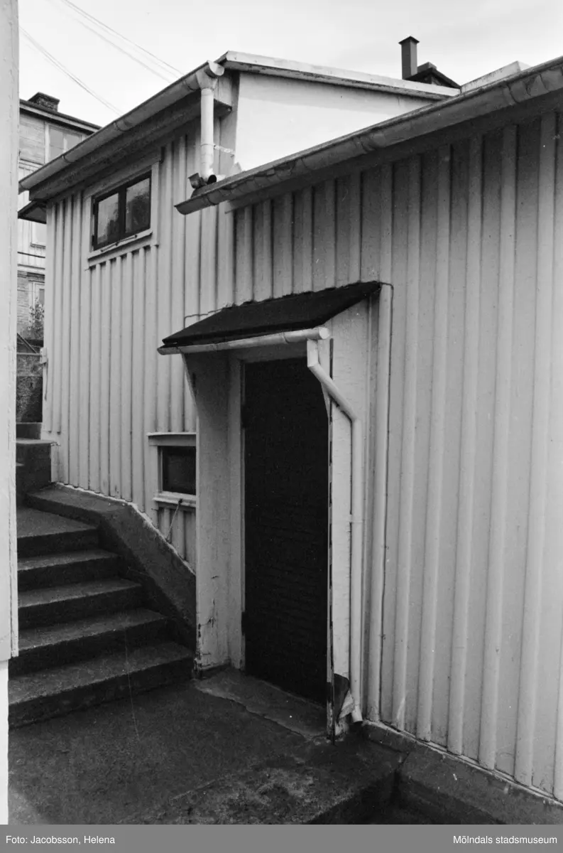 Titel: Exteriörbild av bostadshus på Roten M 21 i Mölndals Kvarnby, 1972. Tomten har en terränganpassad komplicerad planform.