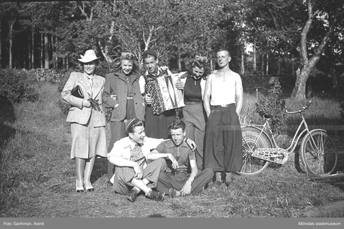 Helmer Garthmans kompisar samlade i Fjärås, 1940-talet. Ståendes från vänster: Okänd, Ingrid Rosberg (gift Gunnarsson), Gösta Gunnarsson med dragspel, Elsa Jinnerstedt och Helmer Garthman. Sittandes från vänster: Charlie Jinnerstedt och Bror Eriksson.