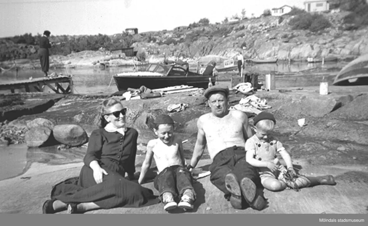 Paus i båtmåleriet för familjen Garthman på Näset, 1950-tal. Från vänster sitter Astrid, Leif, Helmer och Alf.