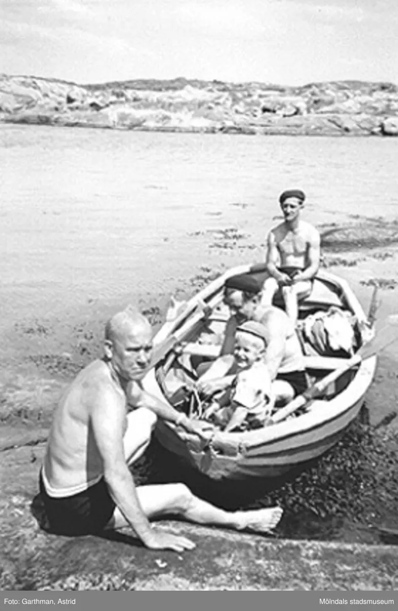 I familjen Garthmans eka vid Näset. Till vänster: Charlie Magnusson. I båten Alf Garthman, fadern Helmer och Arne Jansson. 1950-tal.