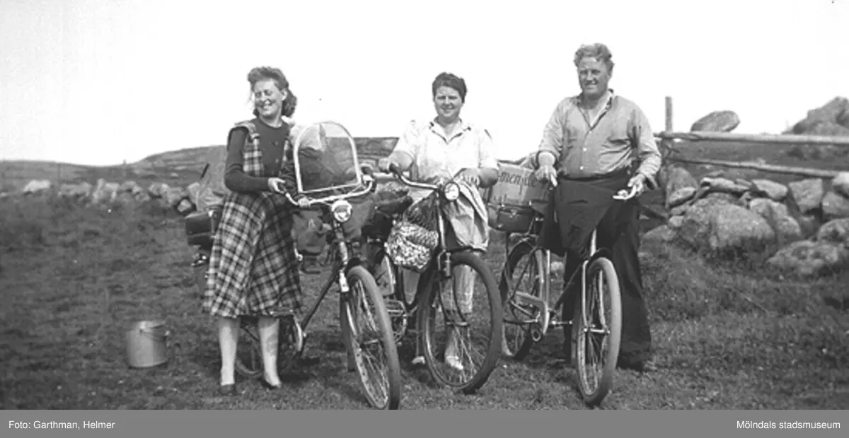 Astrid Garthman med sonen Leif-Åke på styret, svägerskan Gullan (Ester) och Gustav Andersson på cykeutflykt i Fjärås, år 1944. Astrids son Alf Garthman arbetade många år på Mölndals stadsmuseum.