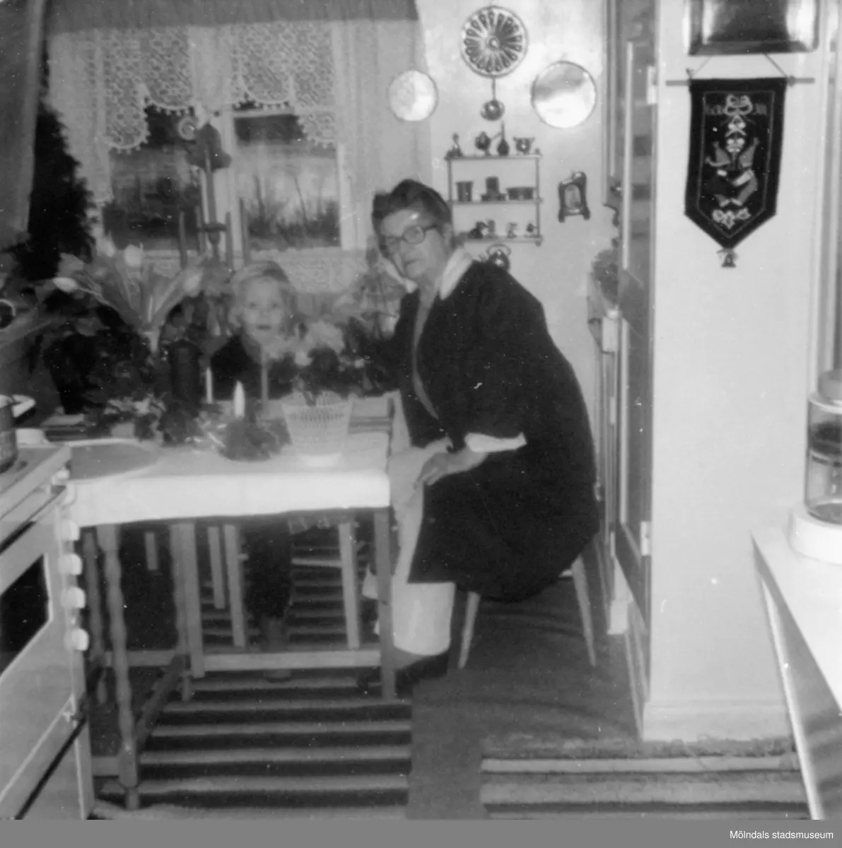 Anna "ve sjön" (Anna Johansson) och broderns barnbarn Lars-Åke, 4 år, sitter vid ett köksbord 27 december 1972. Anna arbetade på Gunnebo slott.