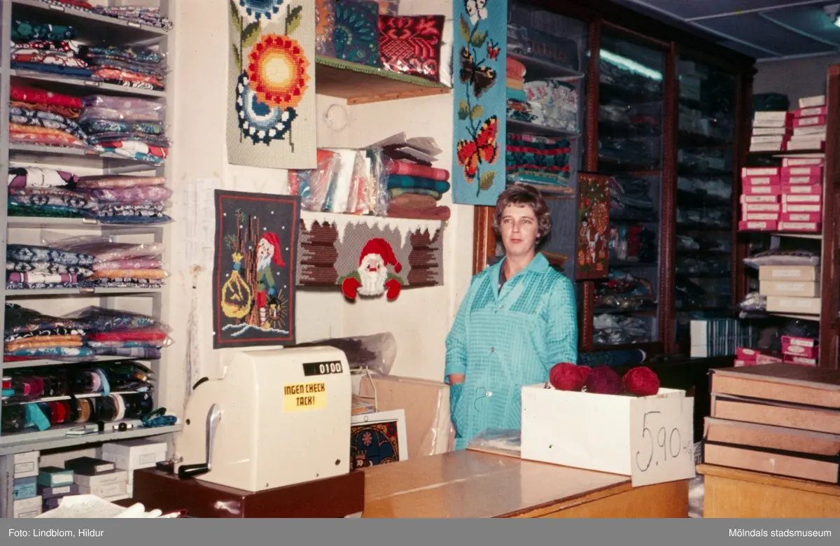 En kvinna fotograferad vid kassan i Kvarnbyns garn och handarbetsaffär med adress Kvarnbygatan 37 i Mölndal, 1970-tal.