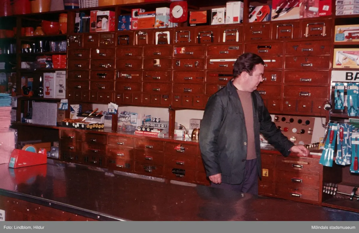 "Kjell i järnhandeln" bakom disken i C.J. Johanssons Järnhandel med adress Kvarnbygatan 27 i Mölndal, 1970-tal.