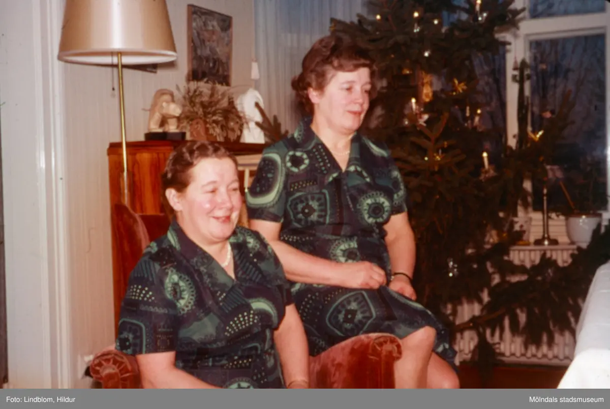 Birgit och Märta Sjöberg, systrar f. 1923, fotograferade sittandes i ett vardagsrum, 1970-tal. I bakgrunden står en julgran. Birgit arbetade på Lackarebäckshemmet.