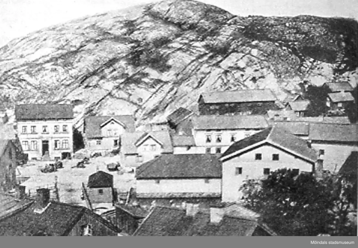 Vy från Fäberget mot Mölndals torg (senare: Gamla torget) med Störtfjällsberget i bakgrunden, 1870-tal.