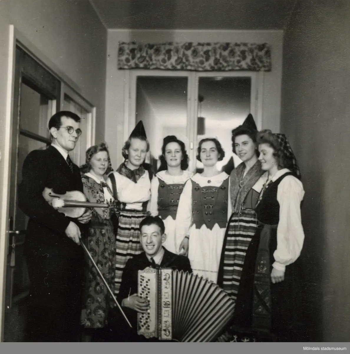 Personalfest på Streteredshemmet i Kållered, år 1955. Ivar, Ella Frohm, okänd, Ingrid Fallgren, okänd, Gunvor Klingvall, Nils Winqvist (dragspel).