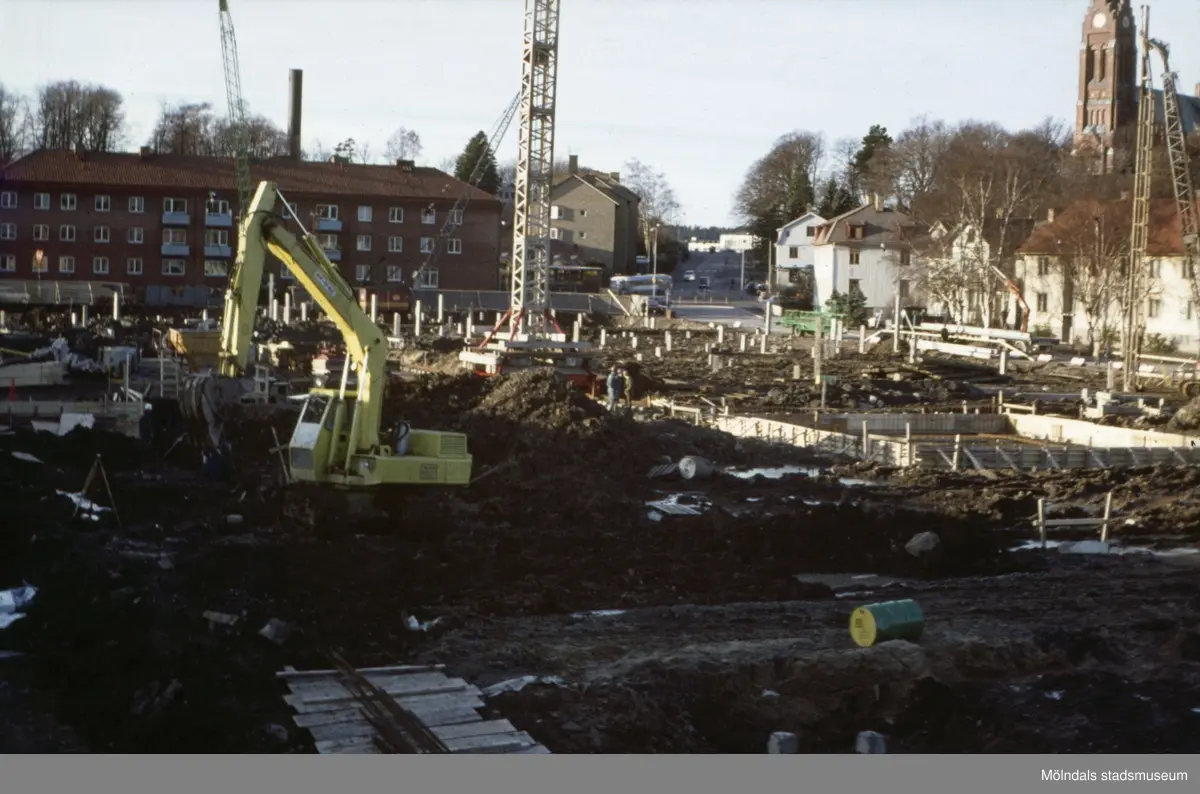 Centrumhuset under byggnation vid Frölundagatan i Mölndals centrum på 1970-talet. I bakgrunden till vänster ses även bebyggelse vid Storgatan.