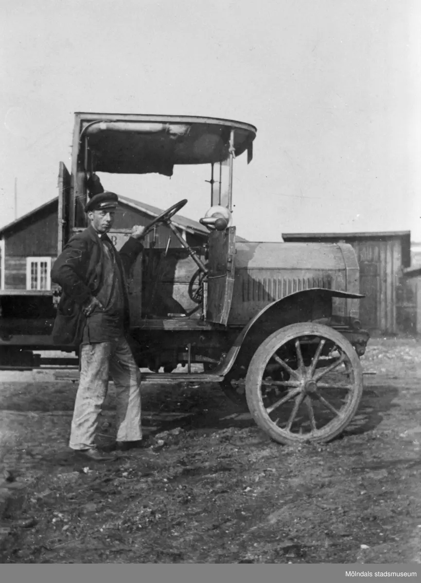 Chauffören Viktor Karlsson står utanför en lastbil vid Forsåkers fabriker i Forsåker, cirka 1900-1910. Relaterat motiv: 1993_0169.