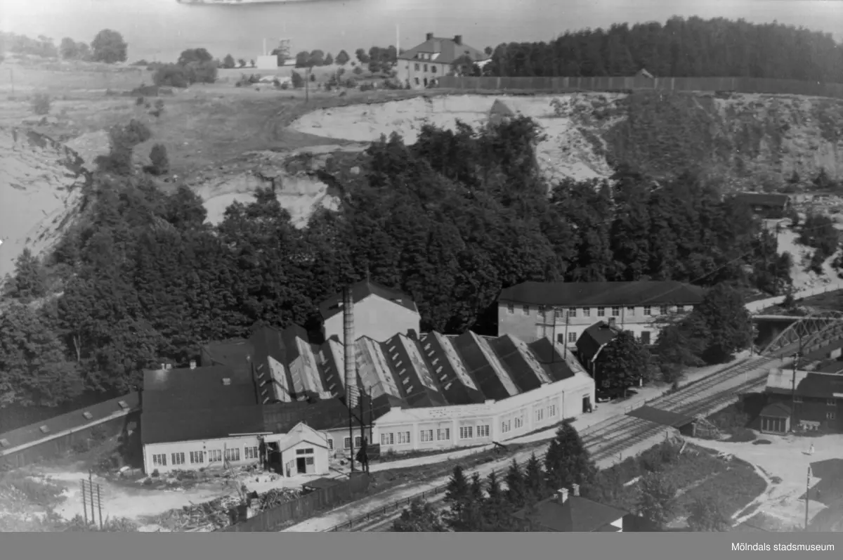 Flygfoto över Forsåkers fabriker vid Grevedämmet i Mölndal, 1930-tal. I bakgrunden ses Stensjön och villan Stensjöhill. Fabriksbyggnaden kallades tidigare för Bettyholm och Carlsfors fabriker. Relaterade motiv: 1993_0162 - 0164.
