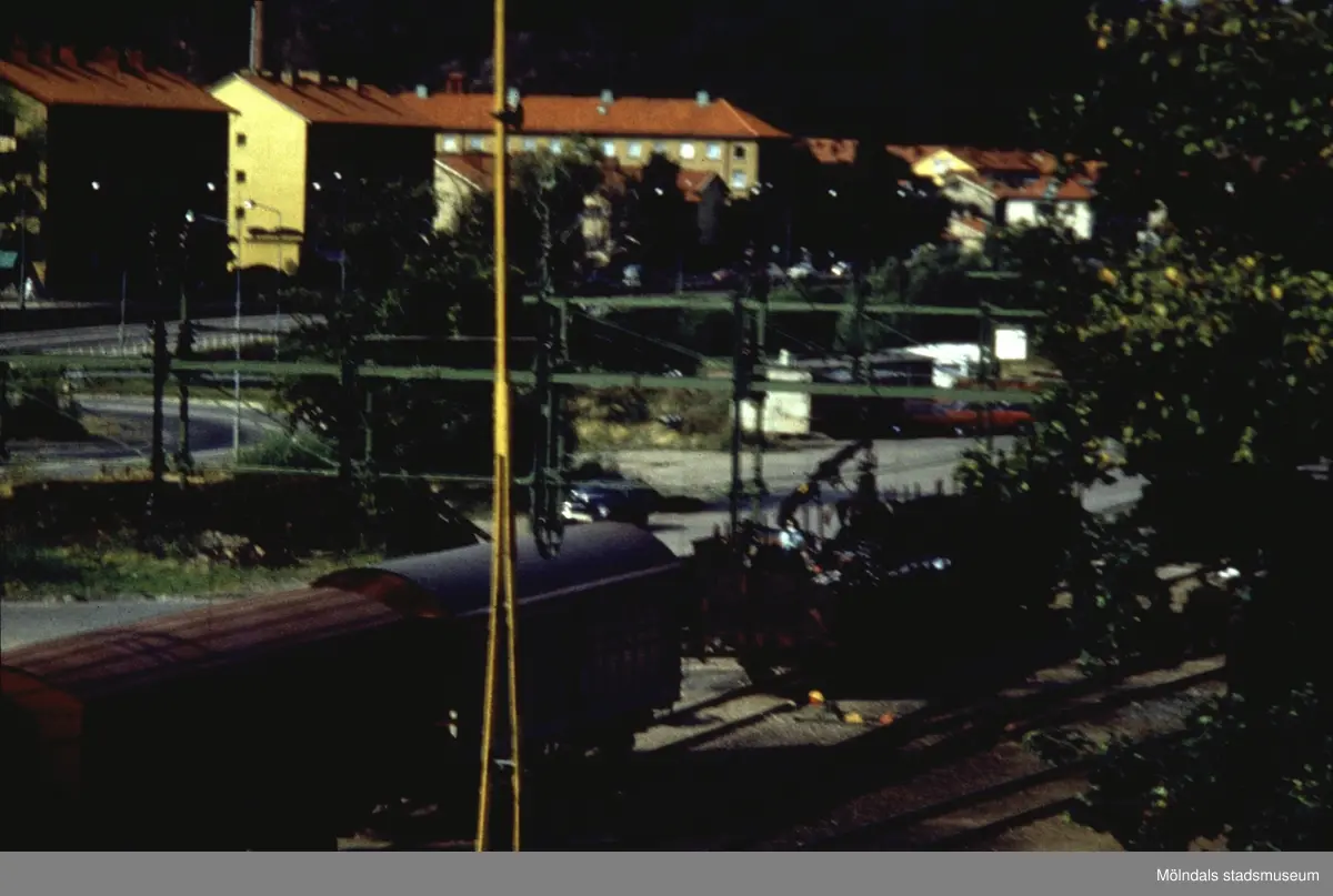 I förgrunden ses en del av järnvägsområdet, i bakgrunden fastigheter vid Göteborgsvägen (Bosgården) i Mölndal, 1970-tal.