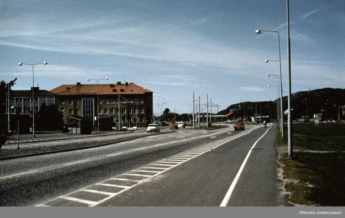 Vy norrut på Kungsbackavägen i Mölndal 1970-tal. Från vänster till höger är det Frölundagatan 3 (Posten) och Frölundagatan 1 (Hantverkshuset, mera känt som restaurang Gillet).