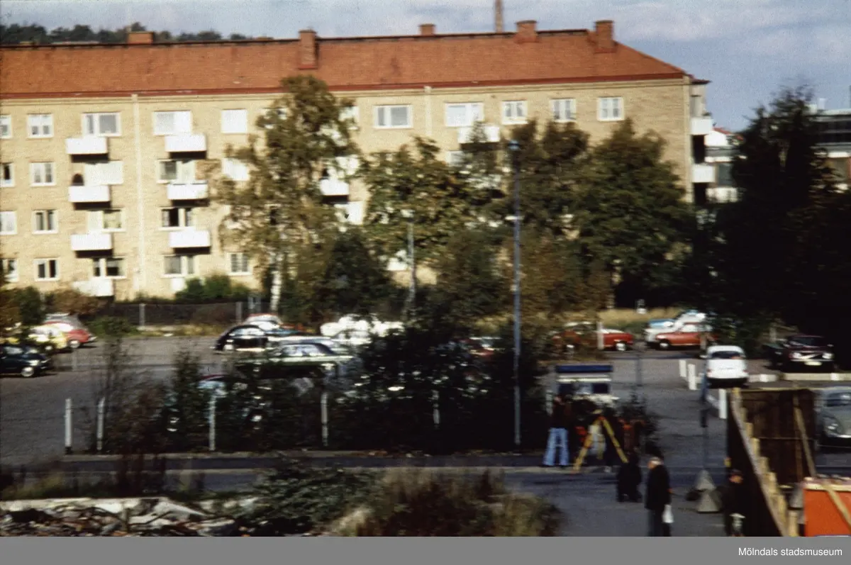 Vy norrut från Brogatan mot en bilparkering och bostadshus utmed Tempelgatan i Mölndal, 1970-tal.