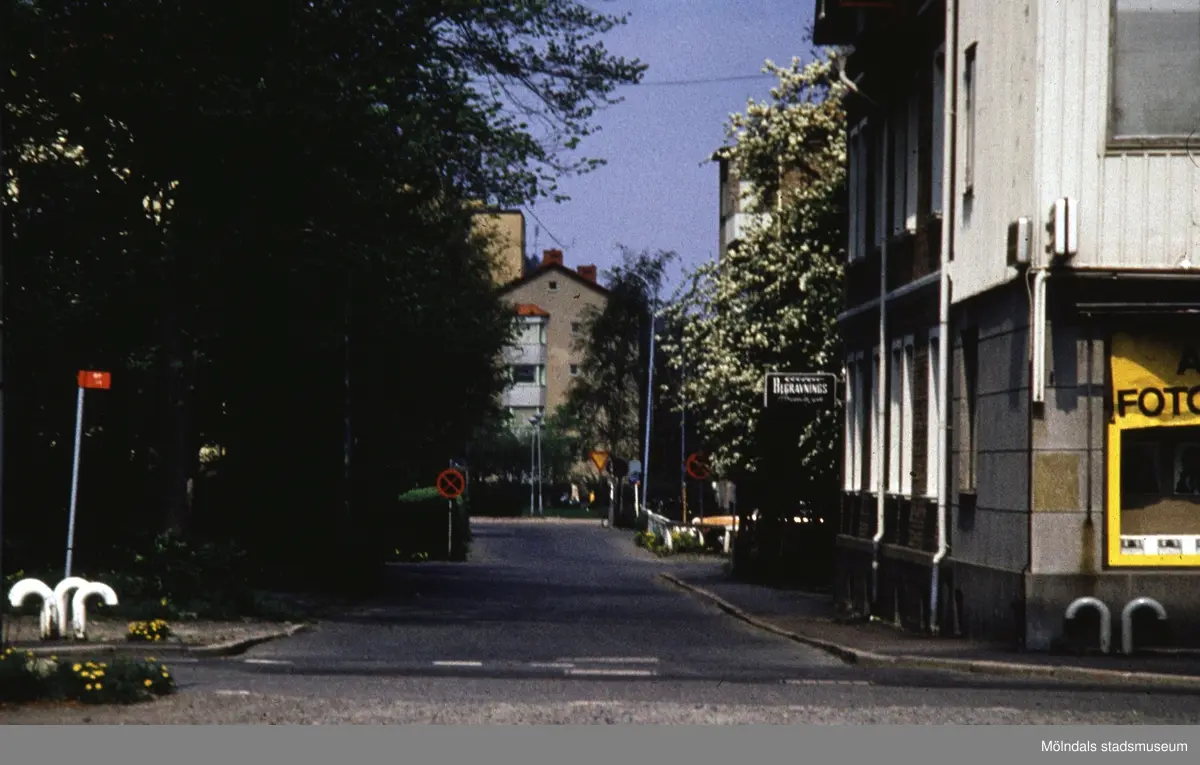 Vy av Medborgaregatan i Mölndal, 1970-tal. Den höga, gula tegelbyggnaden i bakgrundens mitt är Mölndals lasarett.