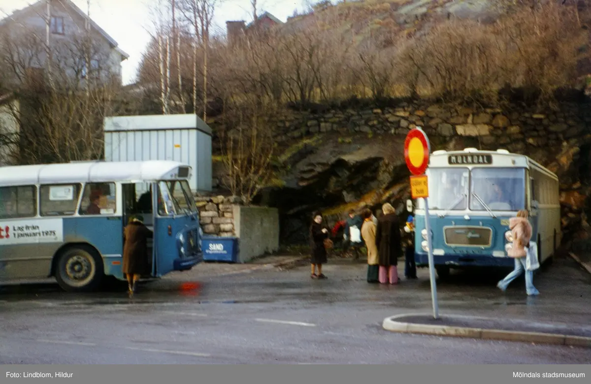 En samling människor står vid två blå bussar på en busshållplats vid Gamla Torget i Mölndal, 1970-tal.