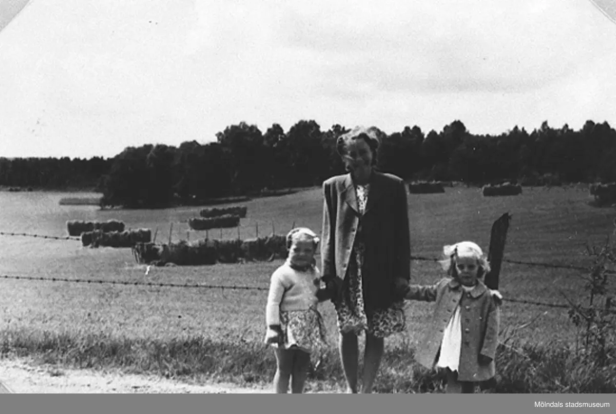 Midsommartid 1947 i Stretered. Rosa Pettersson är på promenad med dottern Eva (gift Kempe) och hennes lekkamrat Lena Englund. I bakgrunden ses hässjor med hö på tork.