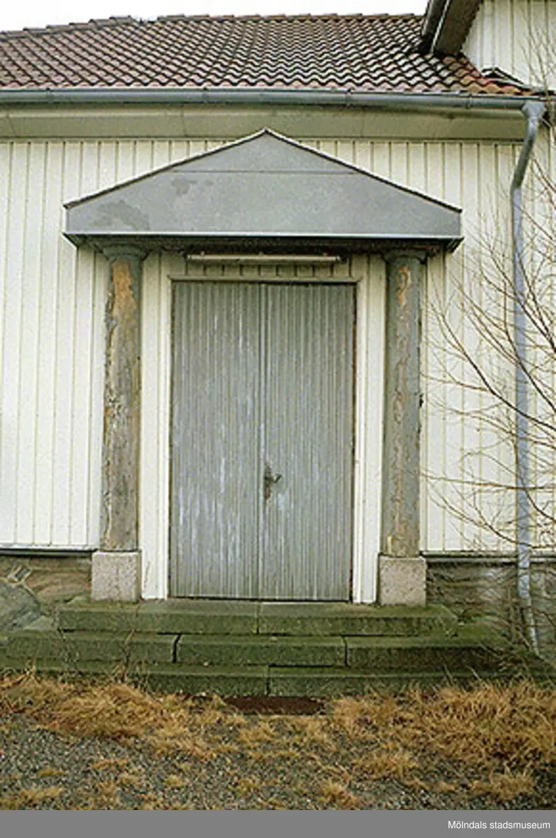 Byggnadsdokumentation av f.d. Metodistkyrkan i Brännås. Entrén på framsidan, sedd från väster.