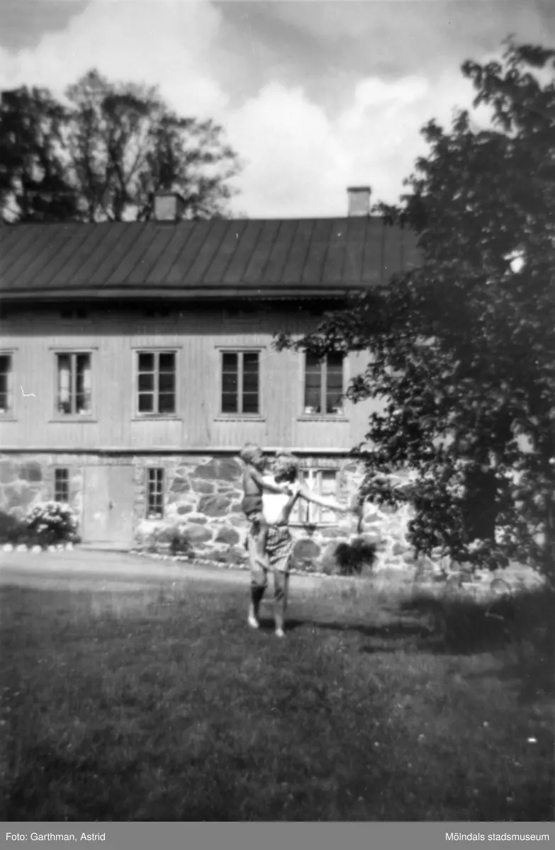 Astrid Garthmans syster Ingrid Karlsson håller sin son Lars i famnen. Man ser Solbacken eller "Skogsvaktarebostaden" i bakgrunden. Gunnebo, 1960-tal.