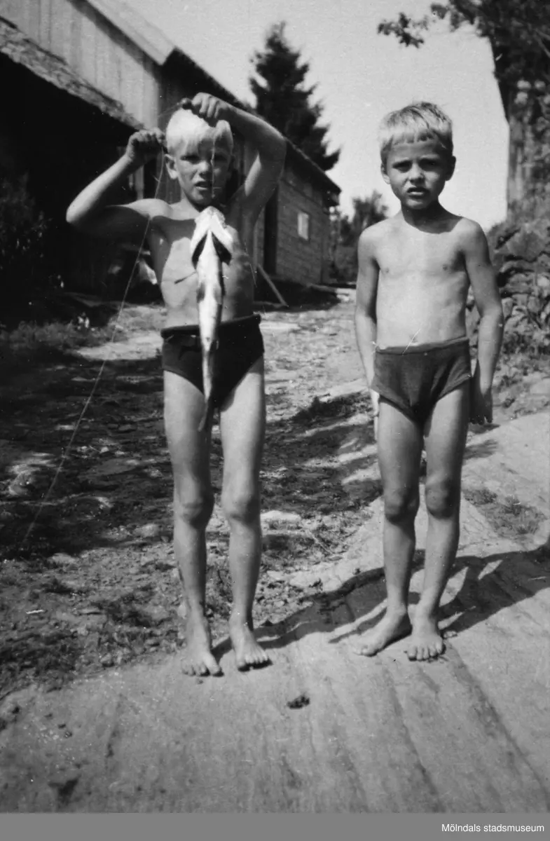 Två yngre pojkar som har fiskat, troligtvis i Tulebosjön cirka 1930. Pojken till vänster håller ett spö med en fångad fisk på kroken. I bakgrunden ses en väg, byggnader och träd.