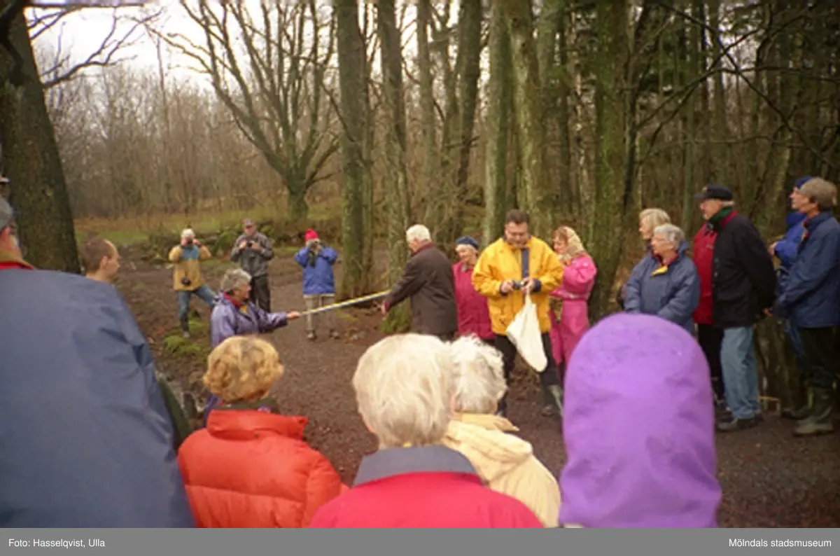 Invigning av Natur- och Kulturstigen i Livered, Kållered, år 2000. Hugo Mattsson klipper invigningsbandet. Hans morfar August Fredriksson hade odlingar runt kulturstigen.