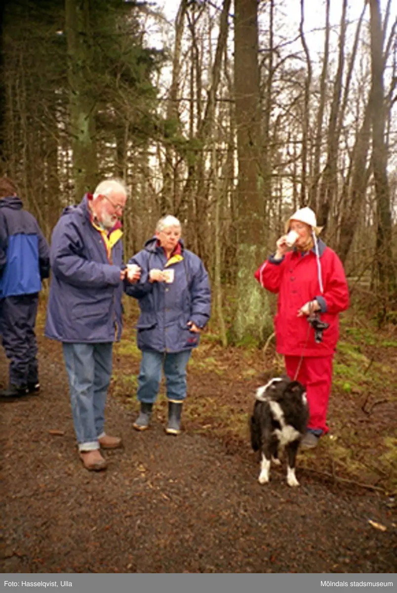 Besökare som dricker kaffe vid invigningen av Natur- och Kulturstigen i Livered, Kållered, år 2000. En kvinna håller en hund i koppel.