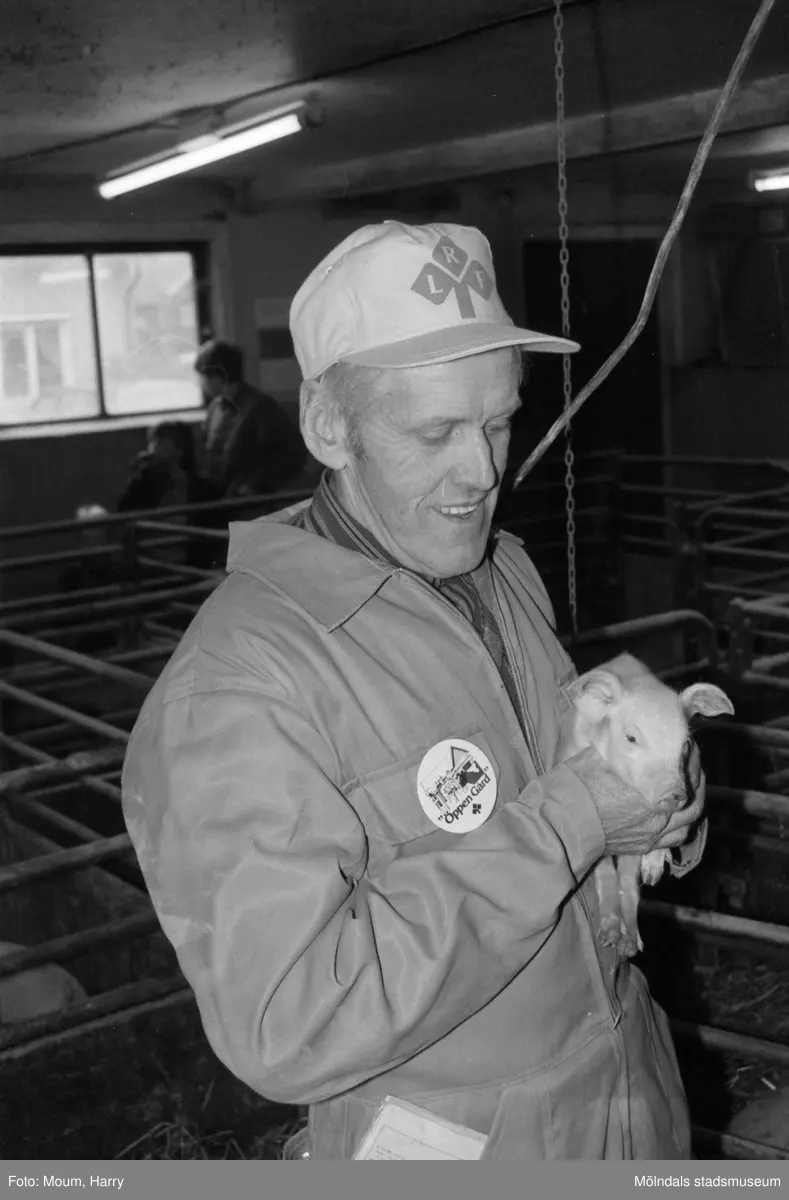 Öppet hus på lantgårdarna Nersgården och Gödeberg i Lindome, år 1984. "Ners-Olle visade gärna de nyfödda grisarna för besökarna."