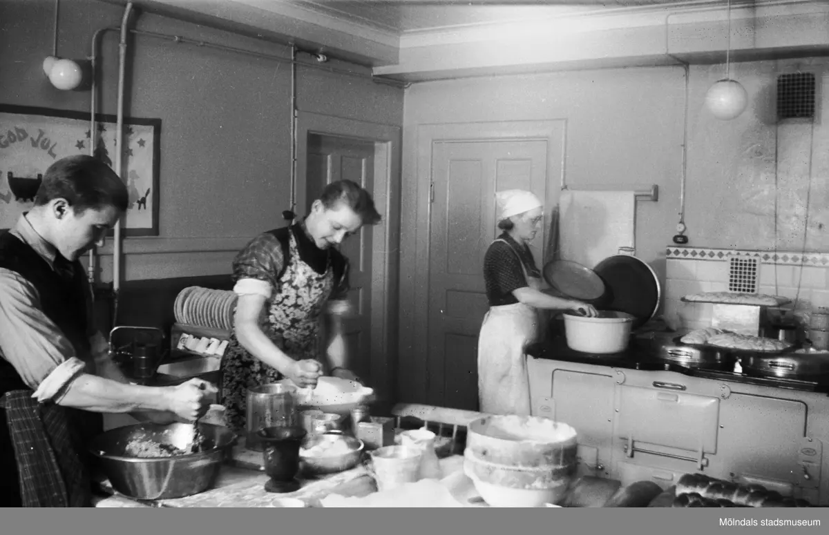Mölndals barnhem (f.d. Holtermanska) Rudbergsgatan. Tre personer som lagar mat. Direktören Martin Holterman i Ostindiska kompaniet ägde Åby gård. 1782 skänkte han 3000 daler silvermynt till Fässbergs församling + ett nybyggt skolhus och trädgård på gårdens ägor vid Åby by. I skolan skulle 10 fattiga barn undervisas i "kristendom, skrivande och något räknande. Holtermans skola fanns kvar till 1875. Då hade donationens ändamål ändrats, och man byggde i stället ett barnhem kombinerat med småskola. 1914 brann barnhemmet och 1915 byggdes ett nytt barnhem på samma tomt. 1929 överlämnades barnhemmet till Mölndals stad.