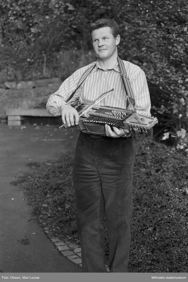 Titel: Porträtt av Sven-Åke Svensson, i Mölndals kvarnby 1990. S-Å Svensson spelar nyckelharpa i Hällesåkers spelmanslag samt i Spelmanslaget Lommebôs.