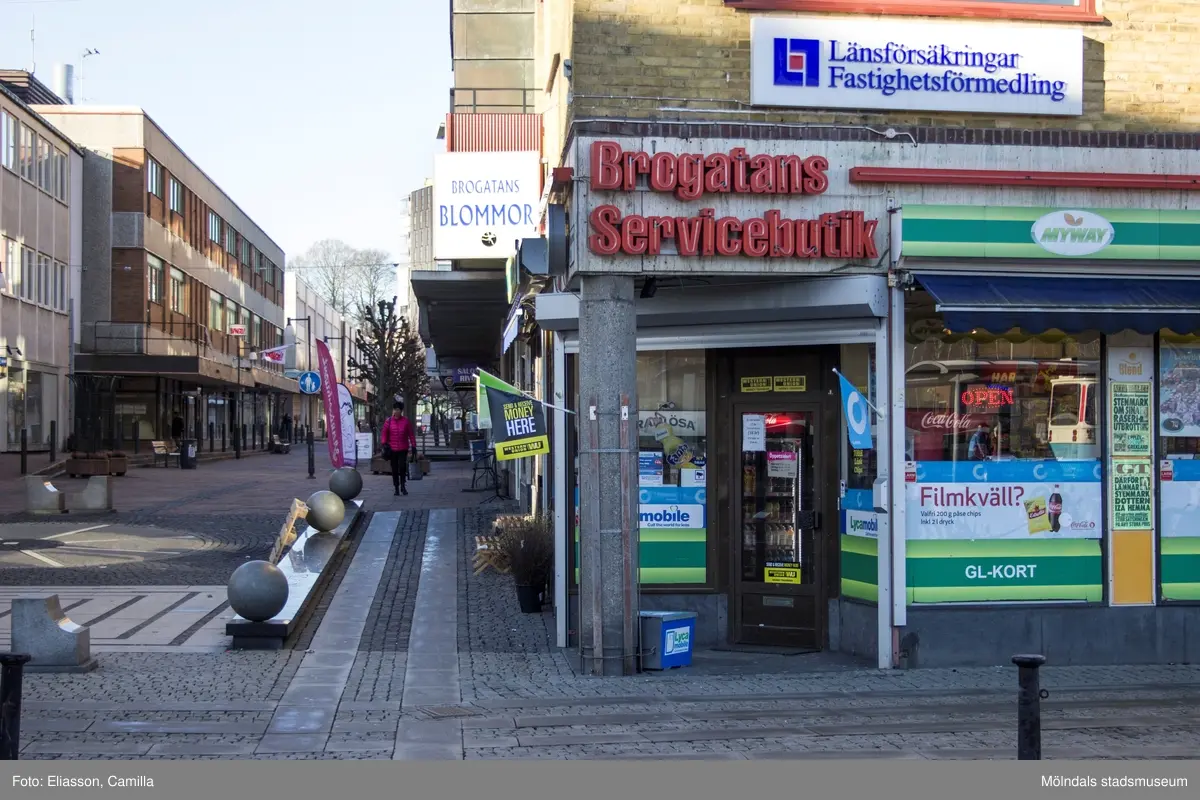 Brogatan (f. Frölundagatan) västerut, år 2015. Till vänster ses fastigheterna Kungsfisken 5 och 4. Till höger ses fastigheterna Havskatten 3 (Centrumhuset) och 17. Bild 1: Hörnet in till Brogatan (Brogatans servicebutik). Bild 2: Utsmyckning i början av Brogatan. Relaterat motiv: 2018_0120. Dokumentation av platsen innan rivning och nybyggnation.