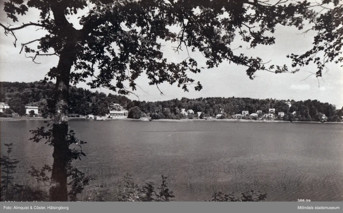 Helenevik vid Rådasjön i Mölndal, ca 1950-tal. Vy från handikappsbadet. Avfotograferat vykort. På bilden syns bland annat fastigheten Heleneviksvägen 6, där fotografiets ägare bor sedan 1985. Huset byggdes 1955 och drivs numera med hjälp av en solcellsanläggning.