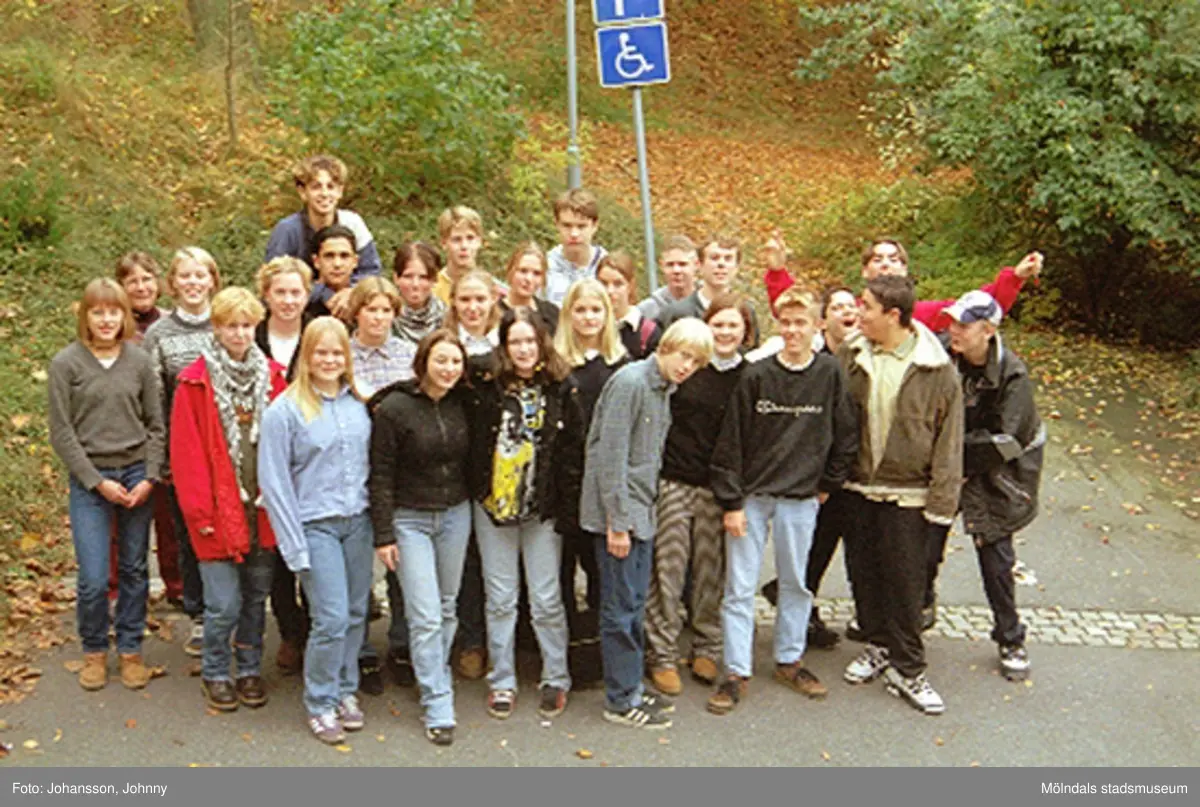 Titel: 1996_1387-1395 är gruppbilder av högstadieelever från Kvarnbyskolan 9A. Eleverna deltog i det skolpedagogiska dokumentationsprojektet ”Mölndalsbro i dag” på Mölndals museum under oktober 1996. Gruppbilder av samtliga deltagande klasser: 1996_1382-1405 och samtliga bilder från den färdiga utställningen 1996_1358-1381.