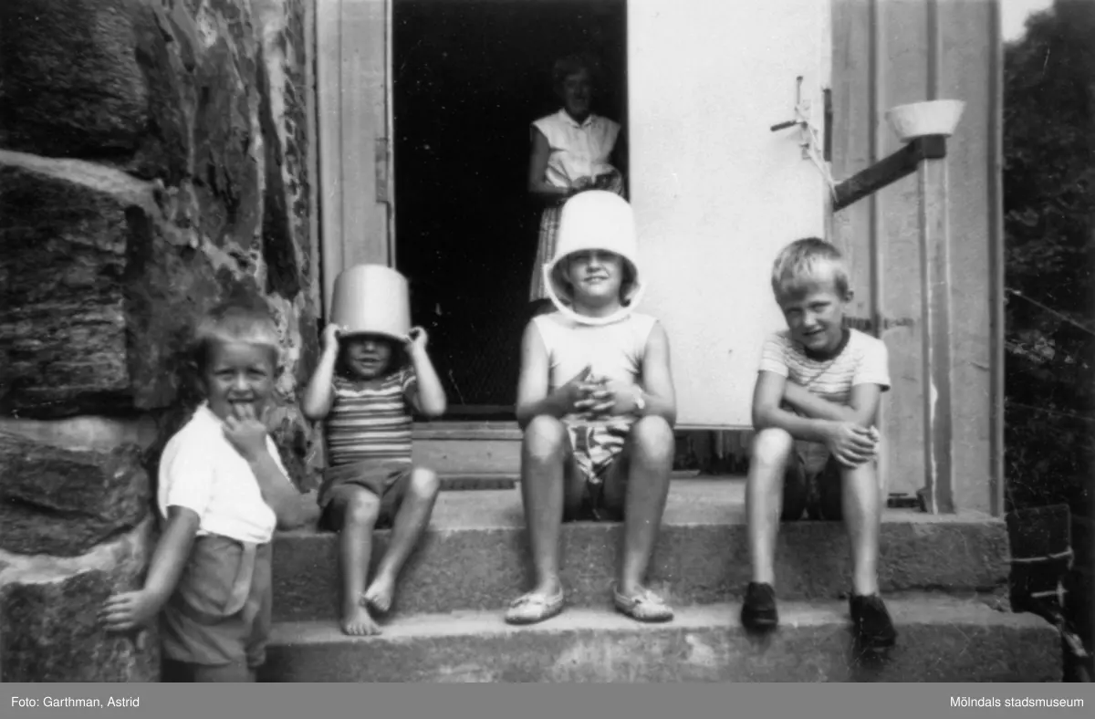 Kusiner utanför Solbacken vid Gunnebo slott, 1950- 60-tal. Från vänster: Jerry Garthman, Reine Andersson, Gunilla Andersson. Barnet längst till höger är okänt.