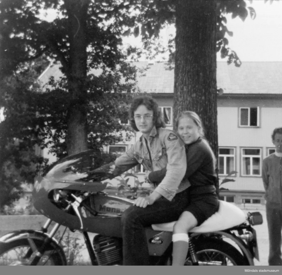Inga-Lill Lipovsék sitter bak på en motorcykel, 1970- till 80-tal. Okänd förare. Hon bodde på Stretereds vårdhem från två års ålder till vuxen ålder.
