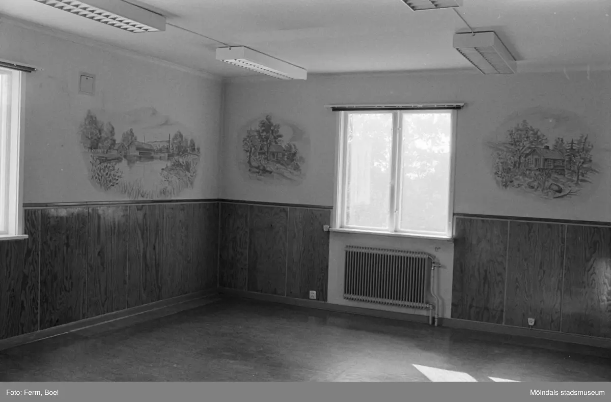 Dokumentation av väggmålningar i Ryets bibliotek 1992. Biblioteket har tömts på grund av nedläggning. Första till vänster är en målning av Kvarnfallet 31 vid Grevedämmet (med Sågdalens järnvägsbro), andra till vänster är Fåfänga vid Nybyggaregatan 3-5. Till höger ses Åkerblads stuga i Rambodal.
