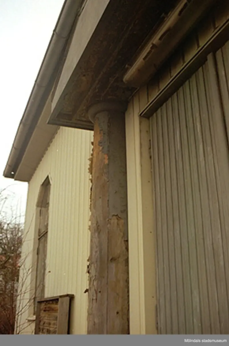 Byggnadsdokumentation av f.d. Metodistkyrkan i Brännås. Byggnadsdetalj av träkolonn med flagnad färg, sedd från väster. Oktober 1998 - januari 1999.