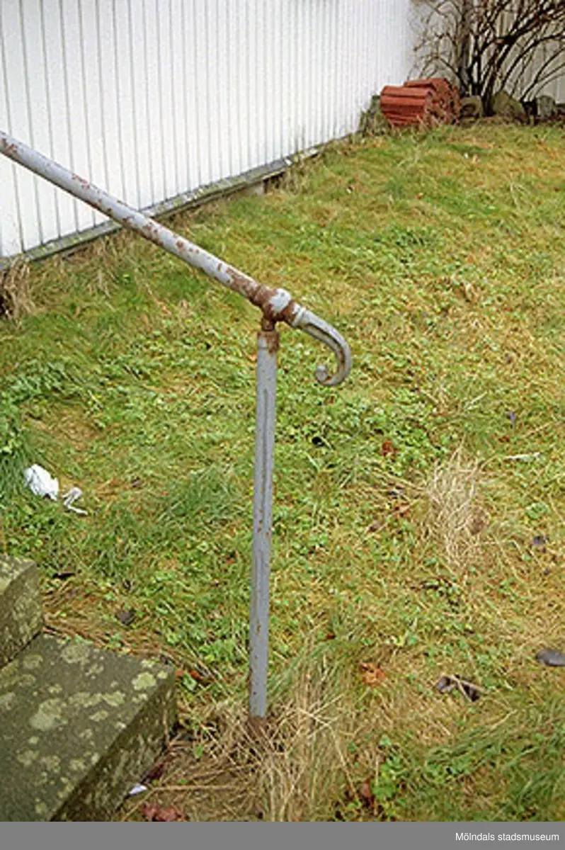 Byggnadsdokumentation av f.d. Metodistkyrkan i Brännås. Del av ledstång till trappa, sedd från öster. Oktober 1998 - januari 1999.