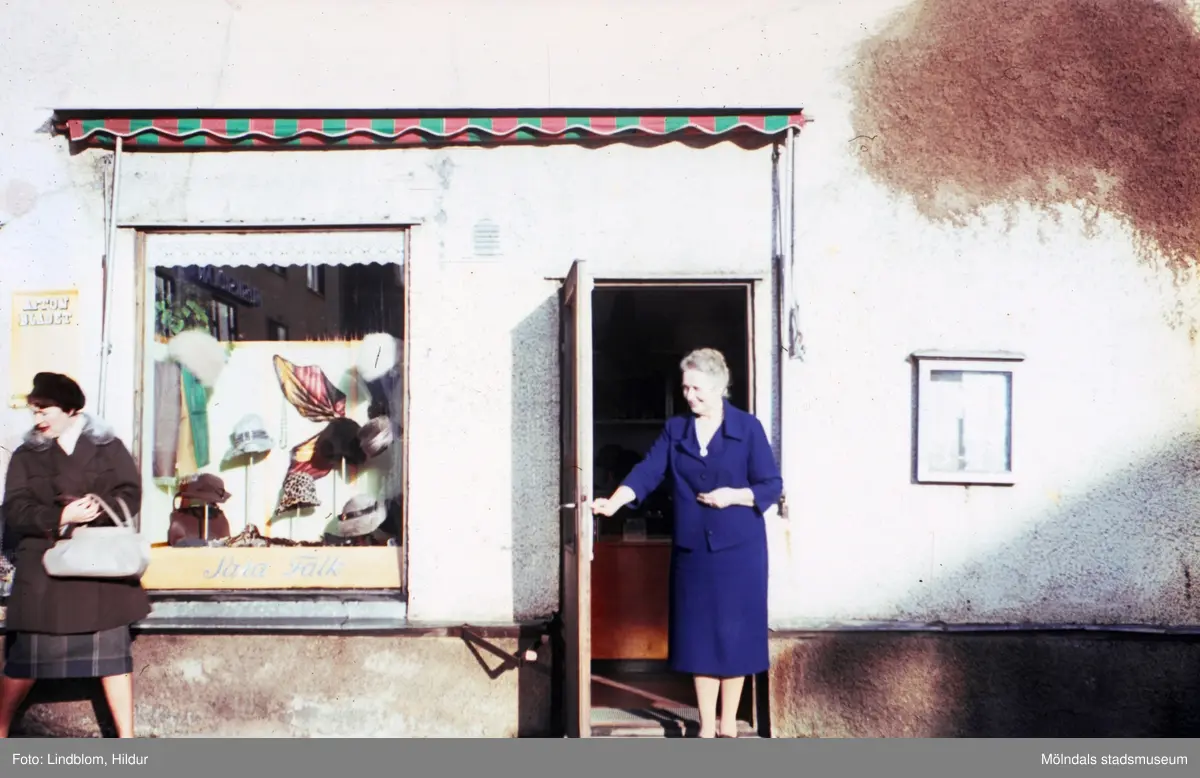 Två kvinnor står utanför Elfrida Isakssons modeaffär med adress Kvarnbygatan 45 i Mölndal, 1960-1970-tal.