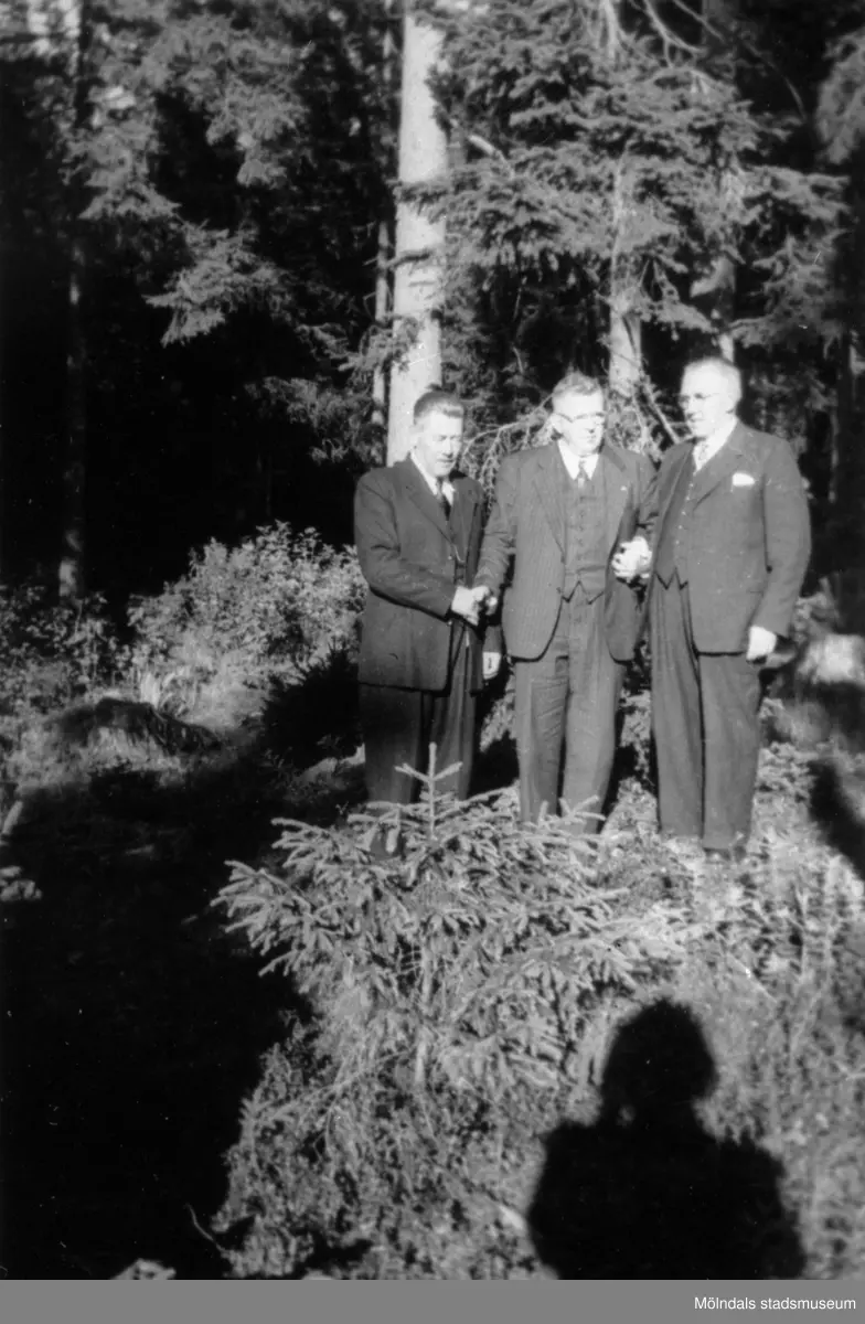 Tre äldre, kostymklädda herrar står i en skog. Det är Gustav, Erik och "Valle" Vilhelm Danielsson som var anställda på Gunnebo . Man ser skuggan av den kvinnliga fotografen (Sparre). 1930-40-tal.