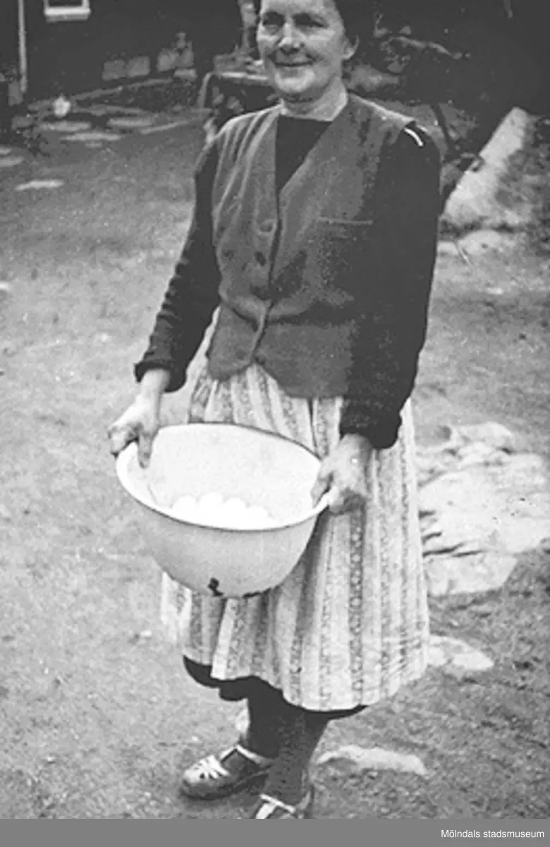 "Mamma myser", 1920-tal i Kållered. En kvinna håller en skål full med ägg.