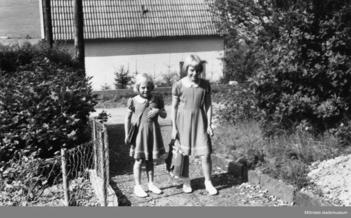 Systrarna Karin (gift: Hansson) och Eva Pettersson (gift: Kempe) på Gamlehagsvägen 7 i Torrekulla, augusti 1954. Det är Karins första skoldag.