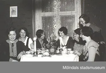 Ur familjen Wallerstedts album. Sju kvinnor sitter runt ett kaffebord med tända ljus.