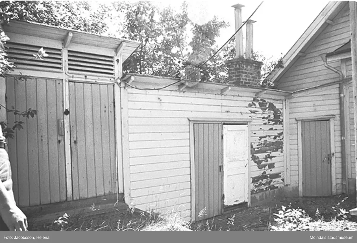Exteriörbild av bostadshus med uthus på Roten M 27 i Mölndals Kvarnby, 1972.