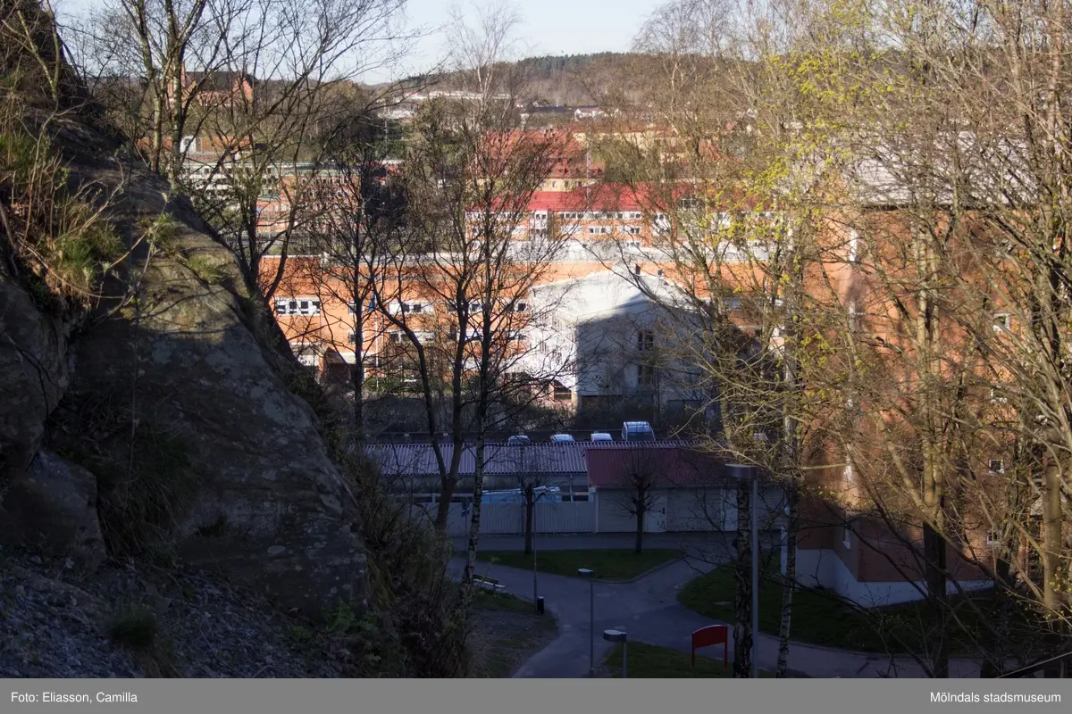 Vy från Lelle-Börjes trappor, som från Kryssgatan leder ner mot Torggatan (f.d Trädgårdsgatan). Trapporna kallas även "Börjes Trappor". Enligt gatunämndsbeslut från 1926 skulle gångvägen och trapporna kallas Trädgårdsstigen. Namnet kom emellertid aldrig att användas. Den vita byggnaden i mitten är Passexpedition, en del av Polishusets röda tegelbyggnad på Torggatan 3. Till höger ser man bostadsområdet Timmermannen på Torggatan 64. I fonden ses Bifrostområdet nedanför Västerberget.