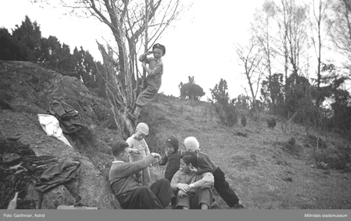 Grannar i Broslätt, 1950-tal. Familjerna Lopez och Garthman är ute i skogen i Wallinsbergen. Från vänster: Helmer Garthman, Angel Lopezs. Bak till vänster: Alf Garthman, Robert Lopez och Angela Lopez. I trädet: Leif Garthman.