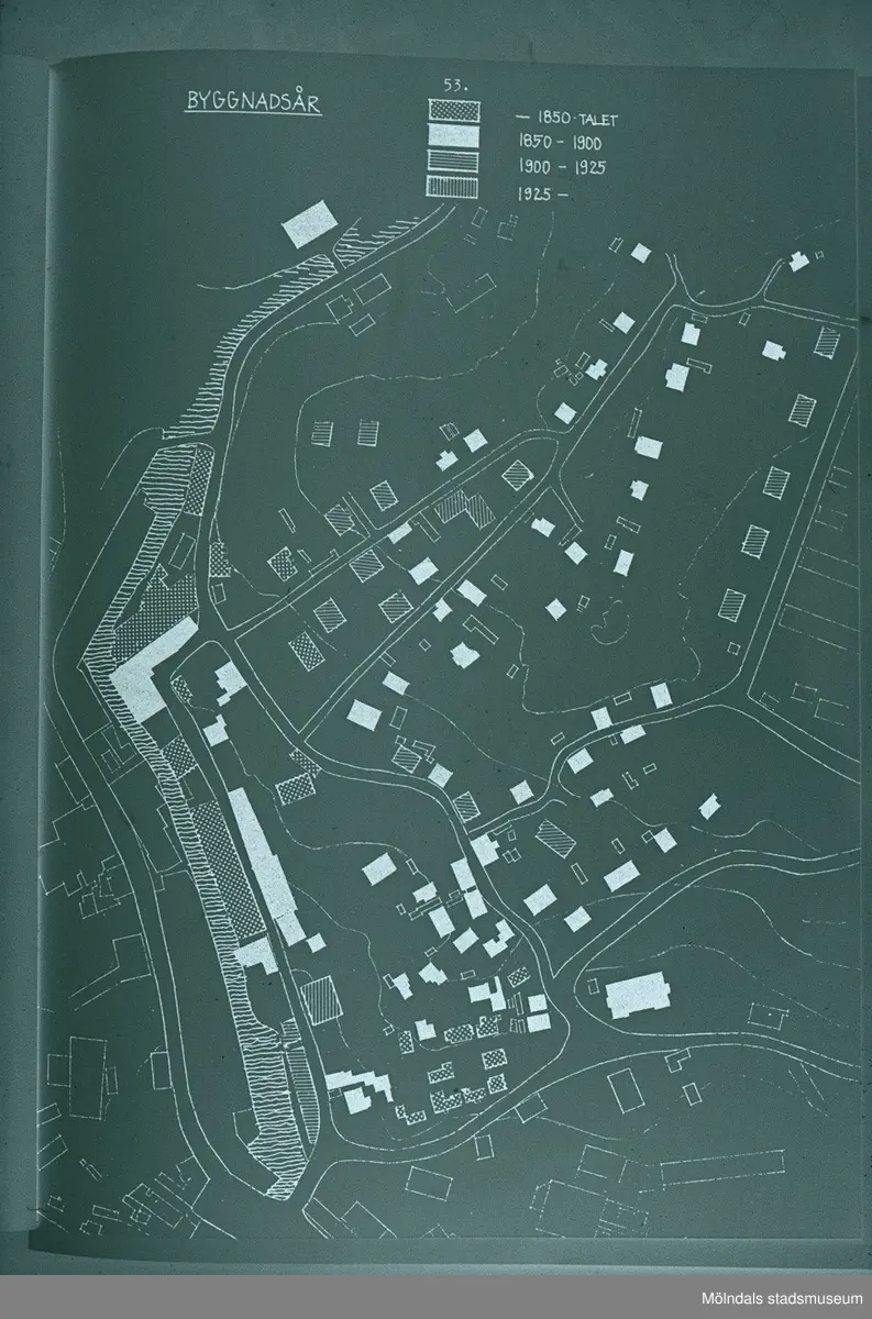 Roten K, L och M samt Götaforsliden i Mölndal. Karta som visar på byggnadernas ålder. Illustration i Helena Jakobssons bok om Mölndals Kvarnby från 1972.