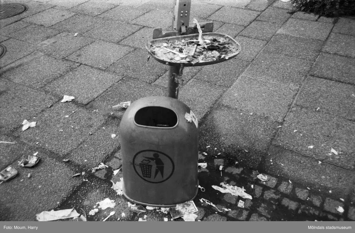 Trasig soptunna i Mölndals centrum, år 1984. "Kvalificerat griseri i Mölndals affärscentrum. Eller hur?"