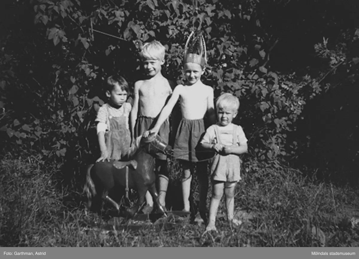 Fyra små pojkar leker cowboy och indianer i bersån på Barnhemsgatan, år 1952. Hästen är tillverkad av en snickare på API (Pumpindustrin i Krokslätt). Från vänster: Bosse och Örjan Stolth samt Leif och Alf Garthman.